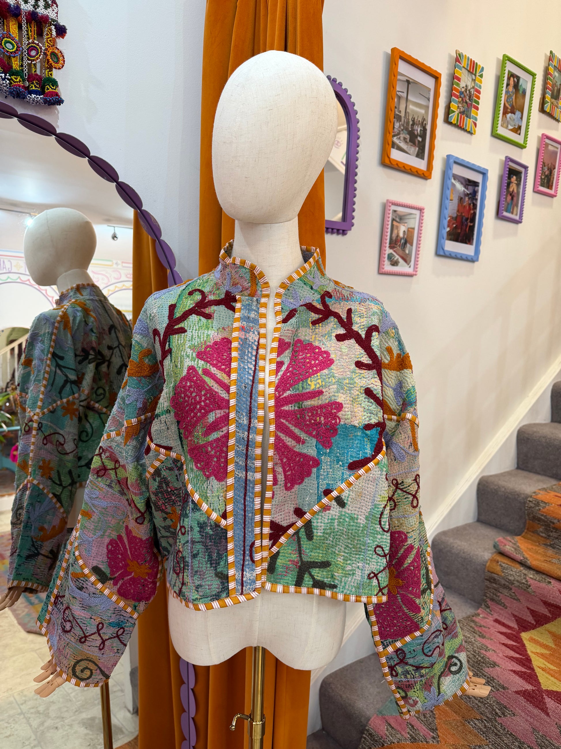 Our Kantha jacket celebrates the rich quilting heritage of South Asia, where layers of recycled or repurposed fabrics are stitched together using a distinctive running stitch technique. This jacket transforms traditional craftsmanship into wearable art. Each piece is a unique patchwork creation, blending texture, history, and intricate floral motifs. The combination of kantha stitching and embroidered flowers makes this jacket not just a garment, but a tribute to heritage and artistry.