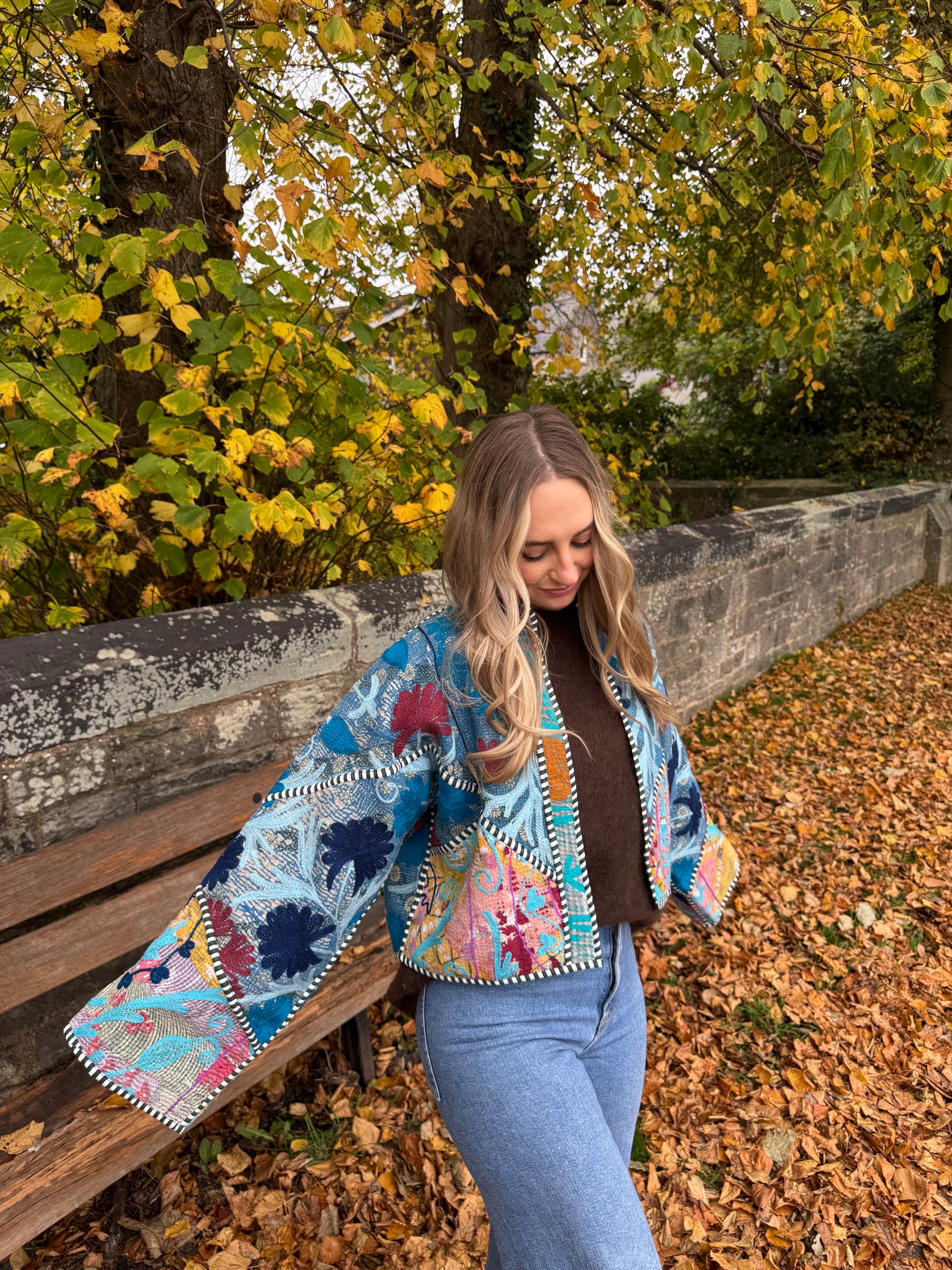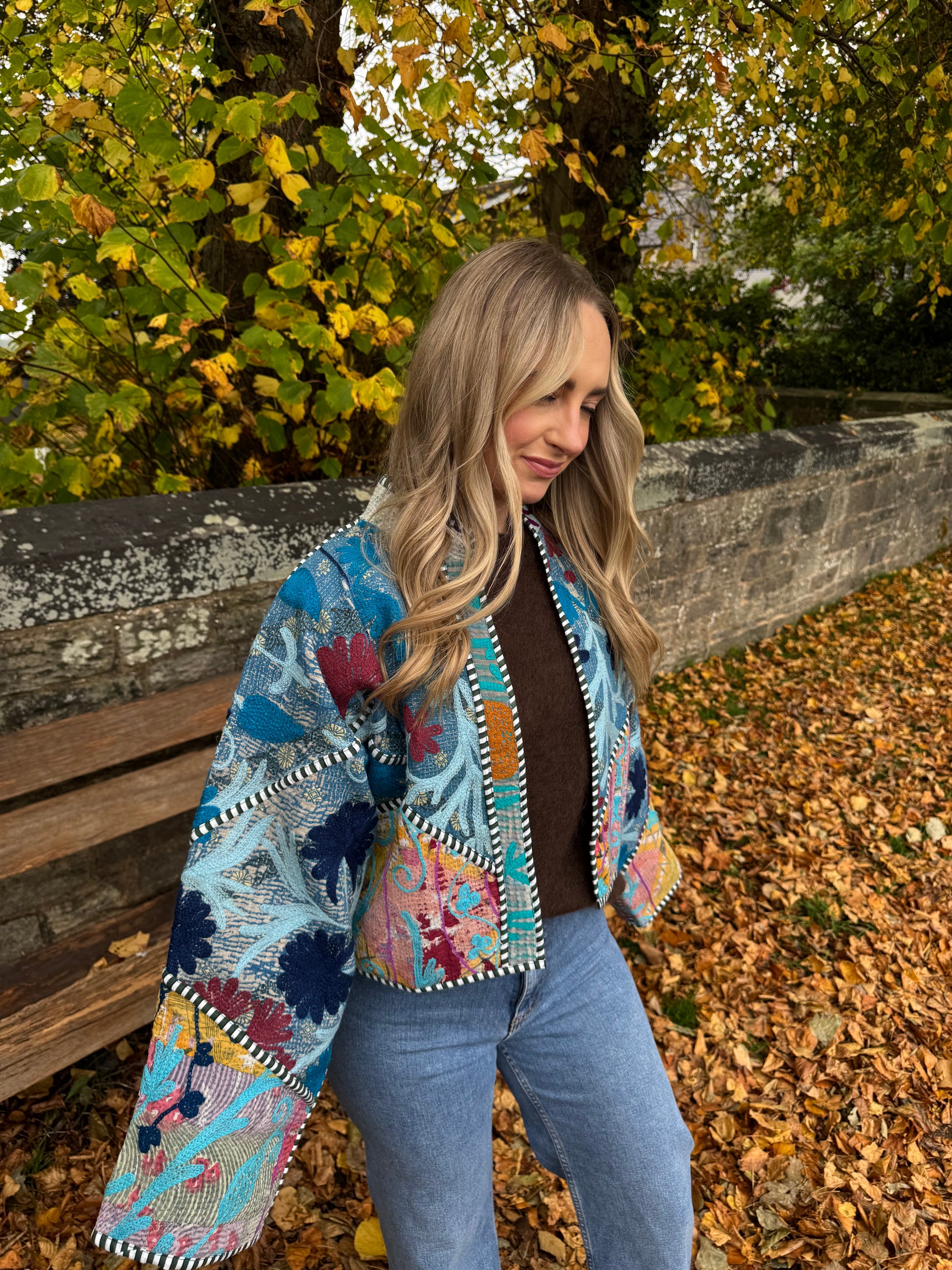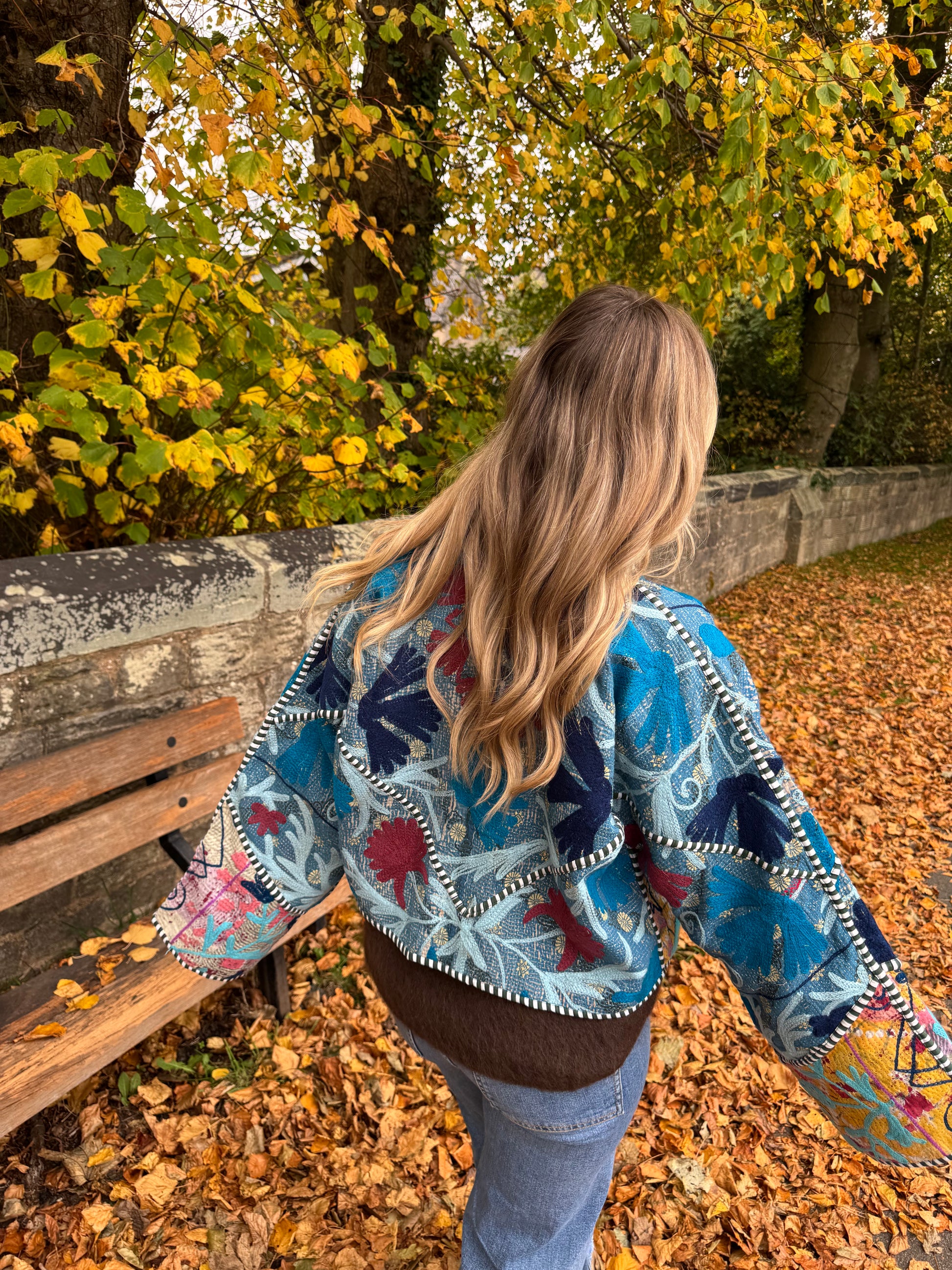 Our Kantha jacket celebrates the rich quilting heritage of South Asia, where layers of recycled or repurposed fabrics are stitched together using a distinctive running stitch technique. This jacket transforms traditional craftsmanship into wearable art. Each piece is a unique patchwork creation, blending texture, history, and intricate floral motifs. The combination of kantha stitching and embroidered flowers makes this jacket not just a garment, but a tribute to heritage and artistry.