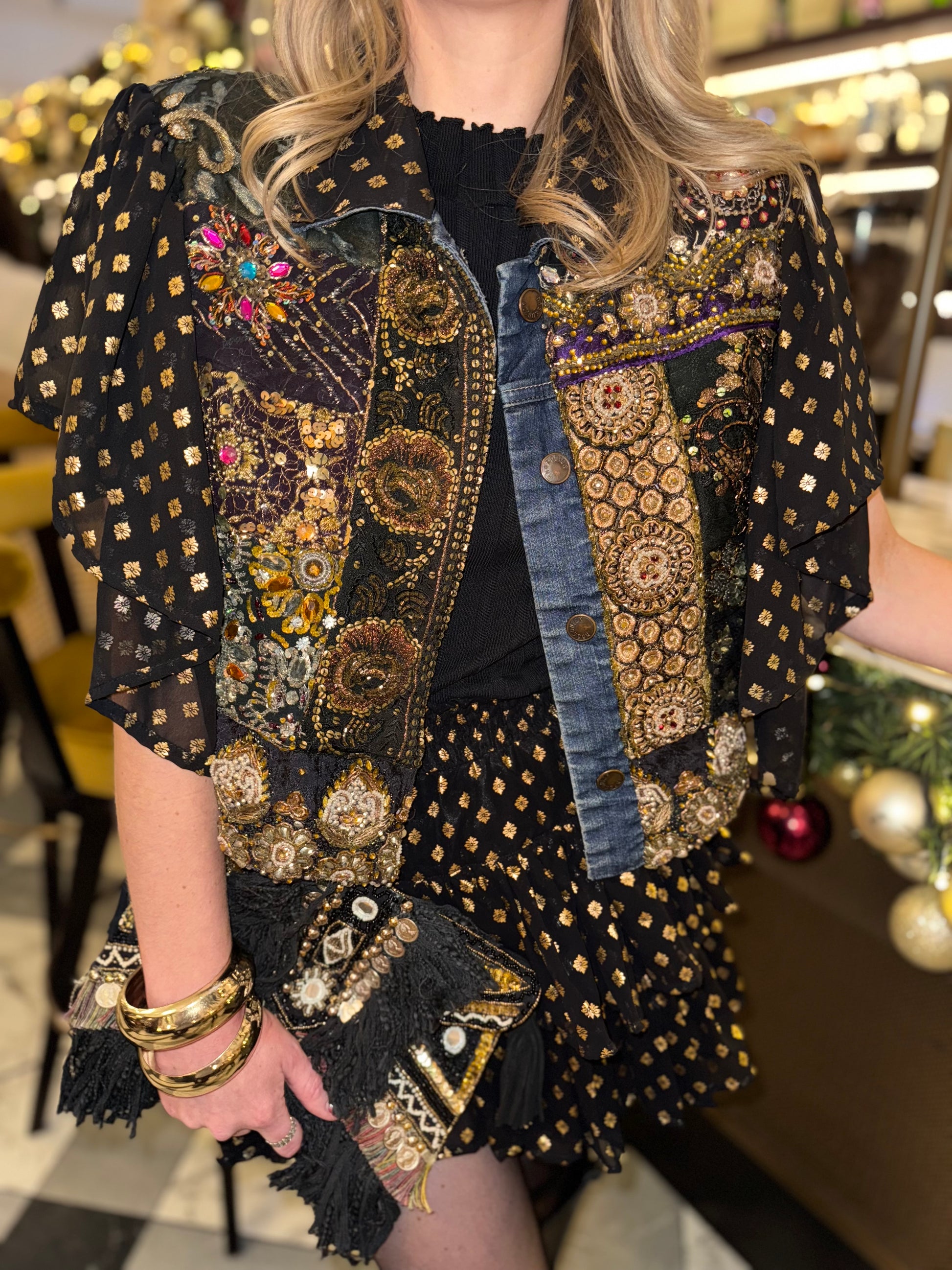 Flowy, effortless, and made for the ravers. This black ruffle short/skort with delicate gold print is the perfect blend of boho and festival magic.