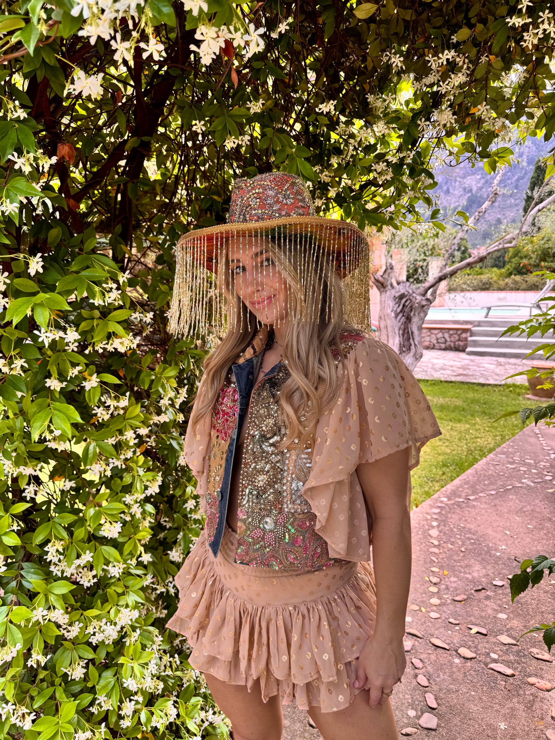 Flowy, effortless, and made for the sun seekers. This nude ruffle short/skort with delicate gold print is the perfect blend of boho and festival magic.