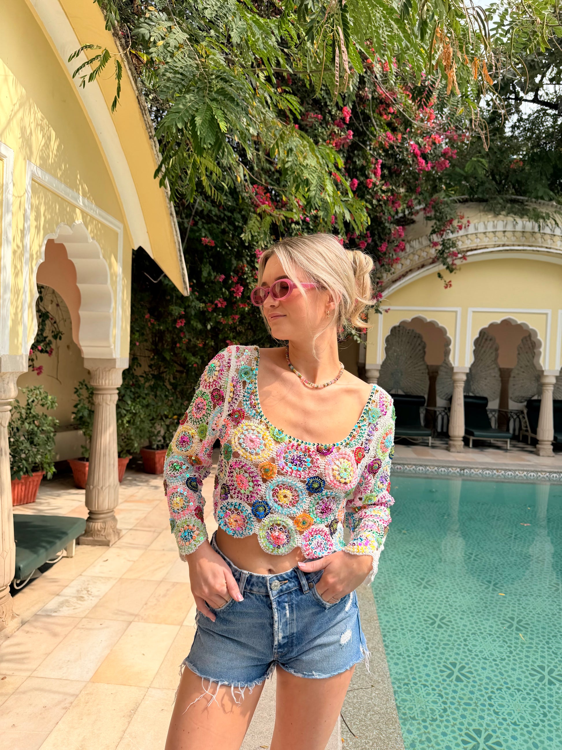 Hand sewn sequins on a crochet top