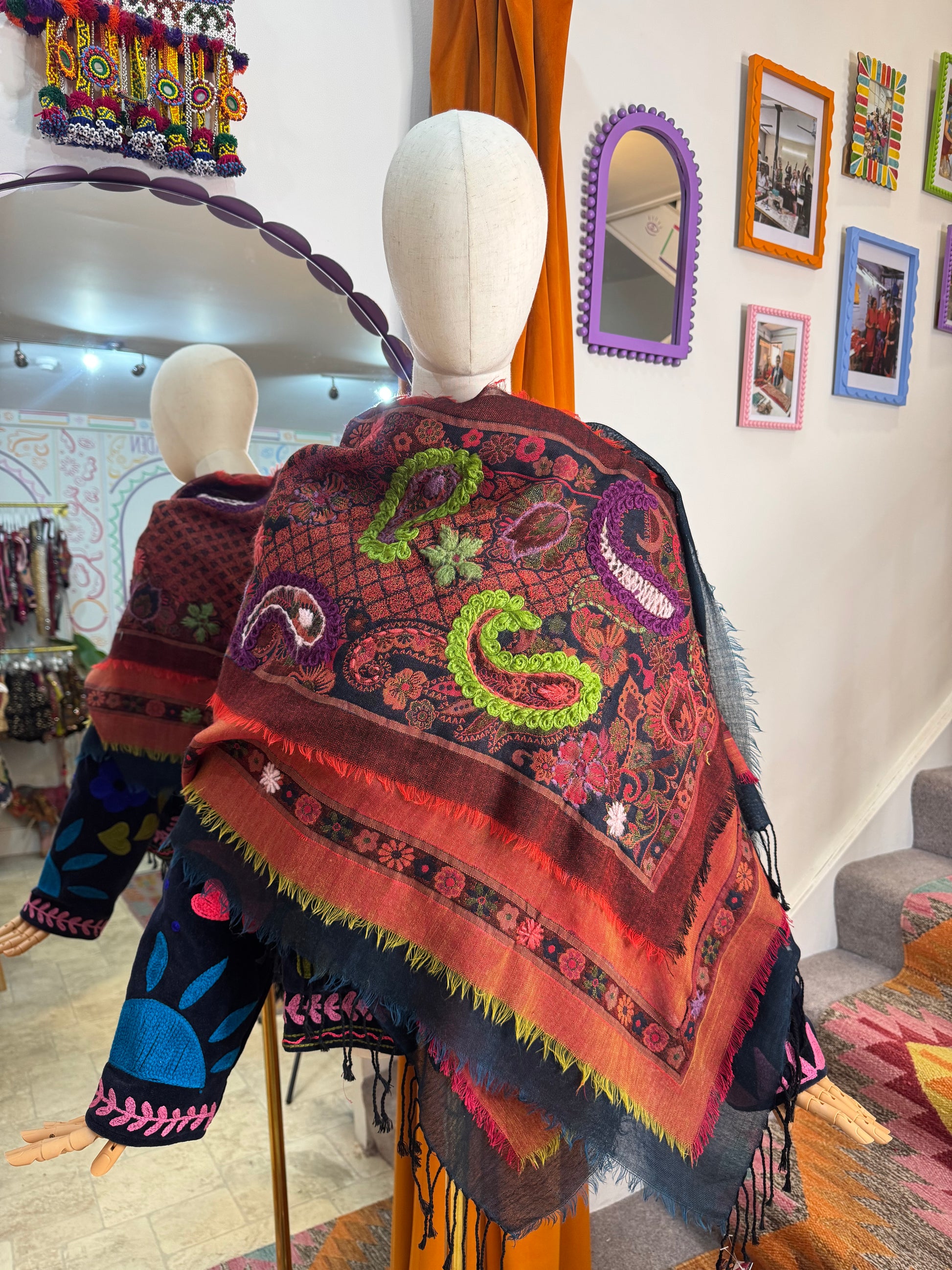 Wool Embroidered Scarf. Flower embroidery by skilled artisans in India. Each piece is hand-stitched with vibrant patterns, carrying the warmth of tradition and the beauty of slow craft.
