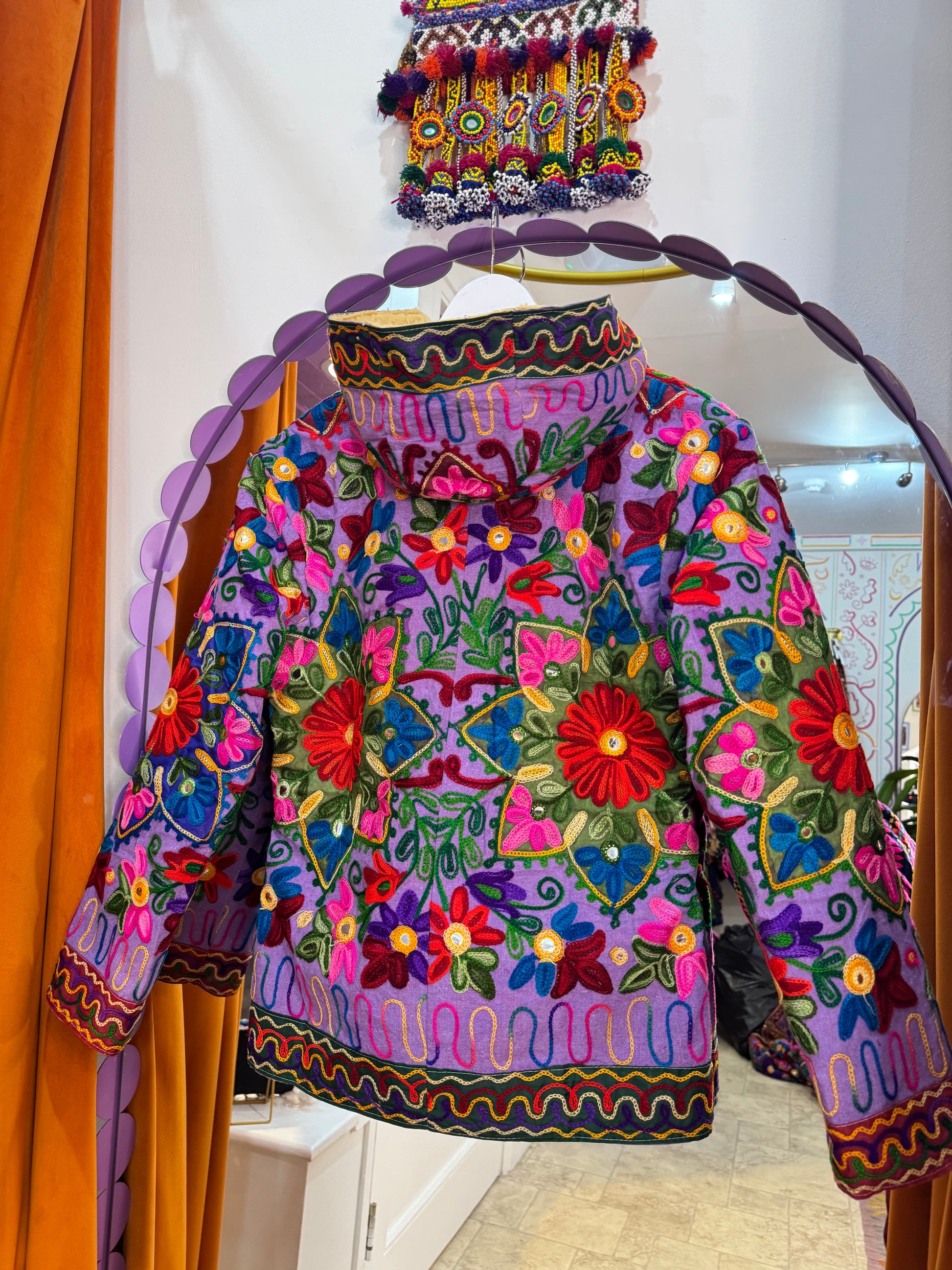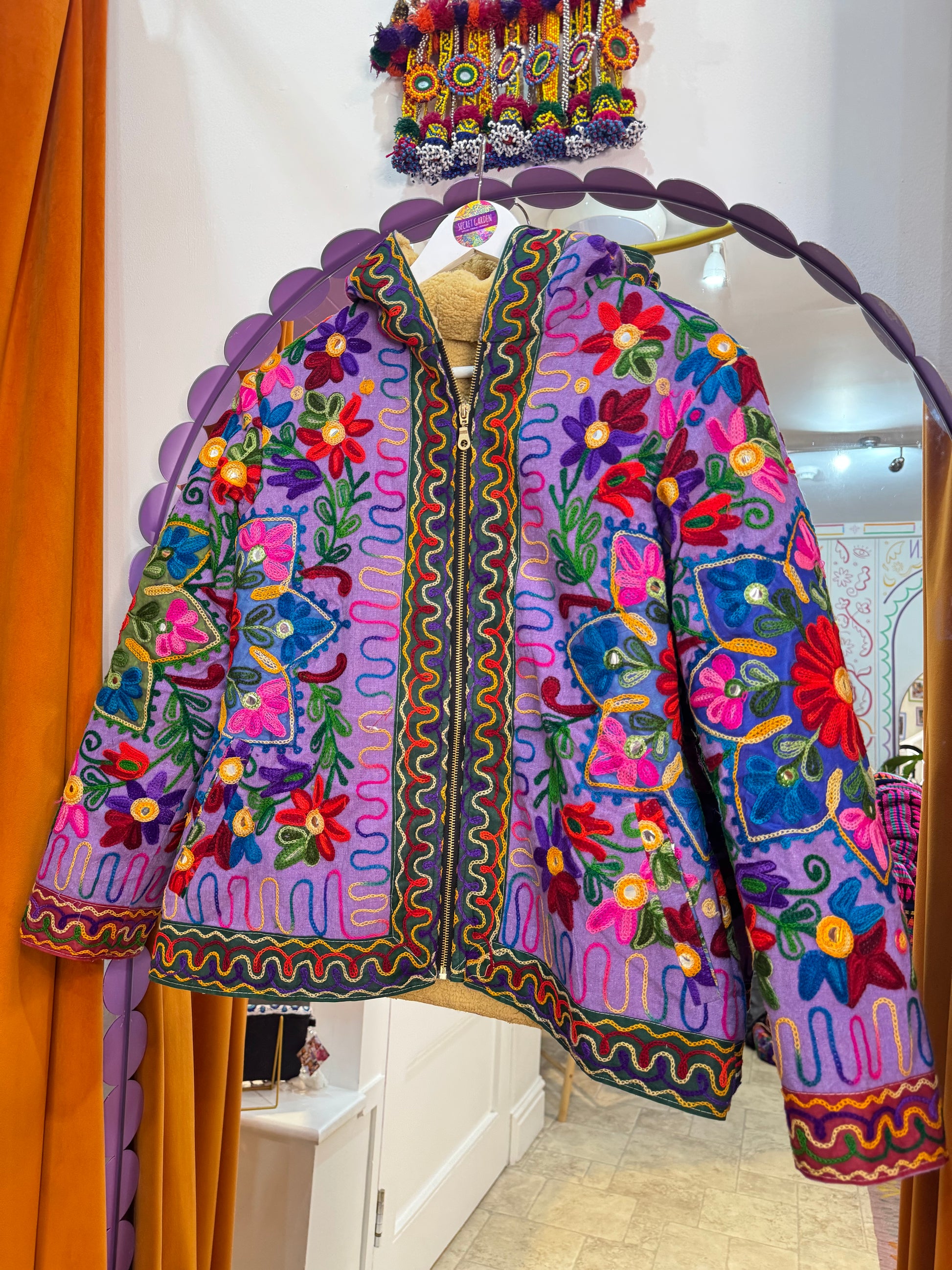 Vintage Hooded Fleece Jacket with zip. Suzani embroidery used to create a beautiful jacket, perfect to style everyday or snug at festivals! Our jacket has 2 pockets at the front and is fully lined with a soft fleece fabric which will also keep you warm.