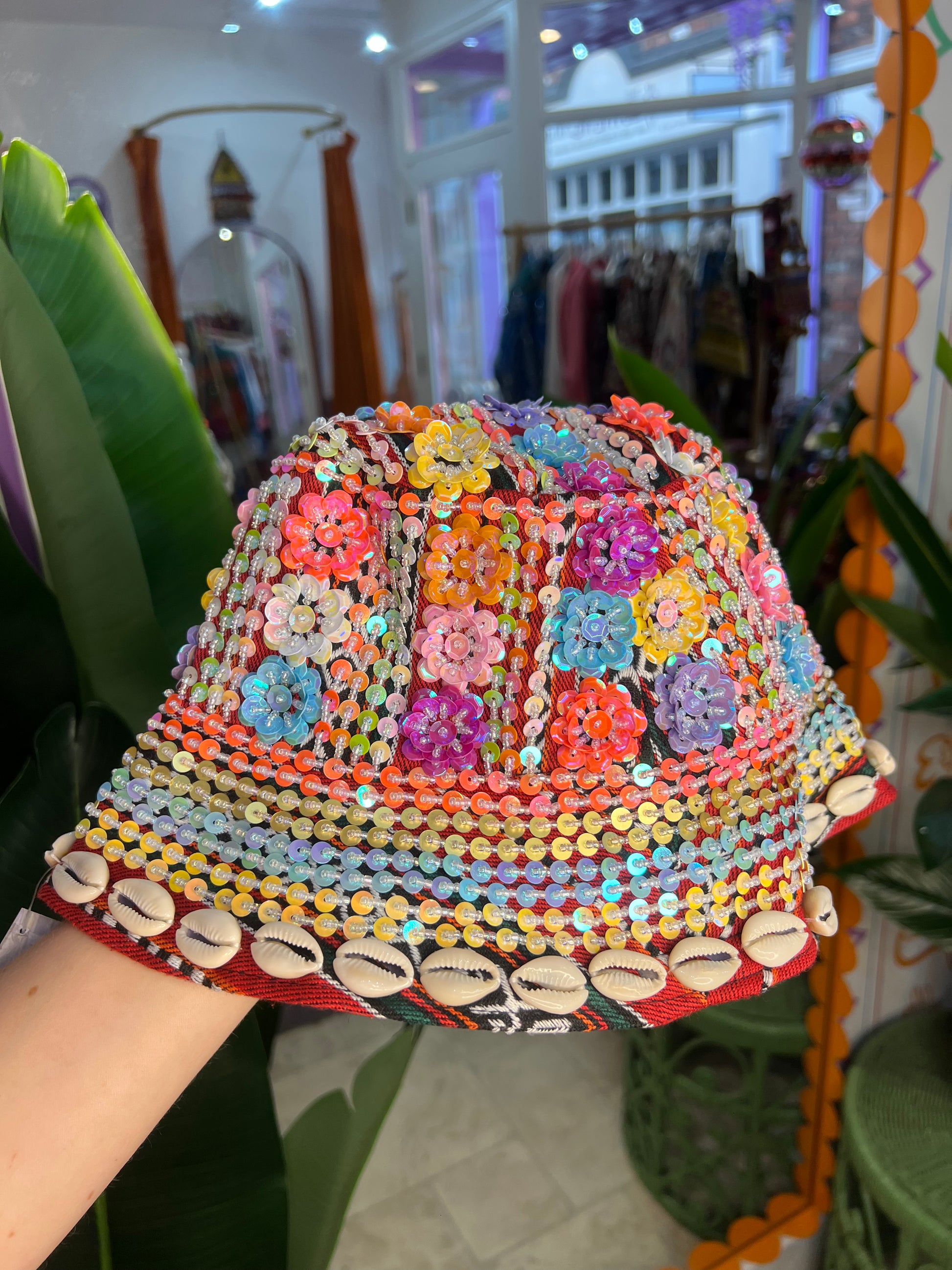 Bursting with colour, sequins, florals and cowrie shells this one-of-a-kind bucket hat brings bold energy to any outfit. Hand-embellished sewn by our artisans in Thailand.