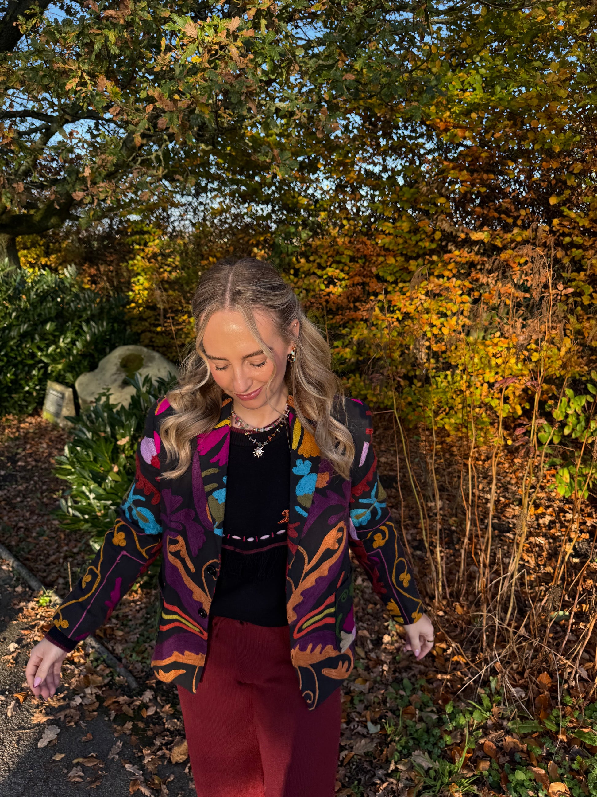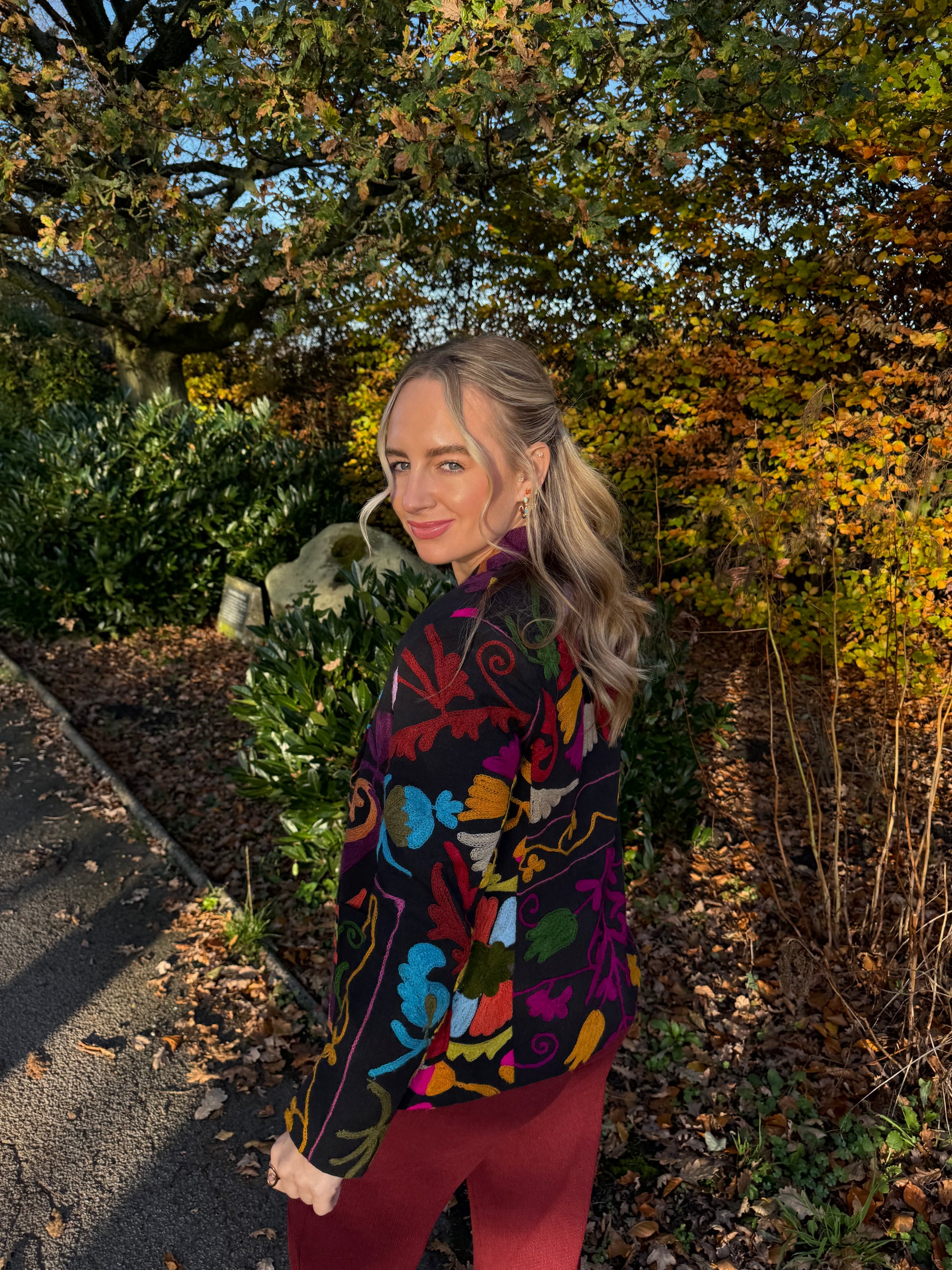 Using sourced vintage materials, we’ve created a stunning blazer that tells a story. Each fabric has lived a life before being upcycled into this unique design. Handmade by artisans in their homes, the slight imperfections in stitching and tracing print add character and authenticity, making each piece truly one-of-a-kind. Embrace the beauty of handmade craftsmanship and sustainable fashion with our Suzani blazer.