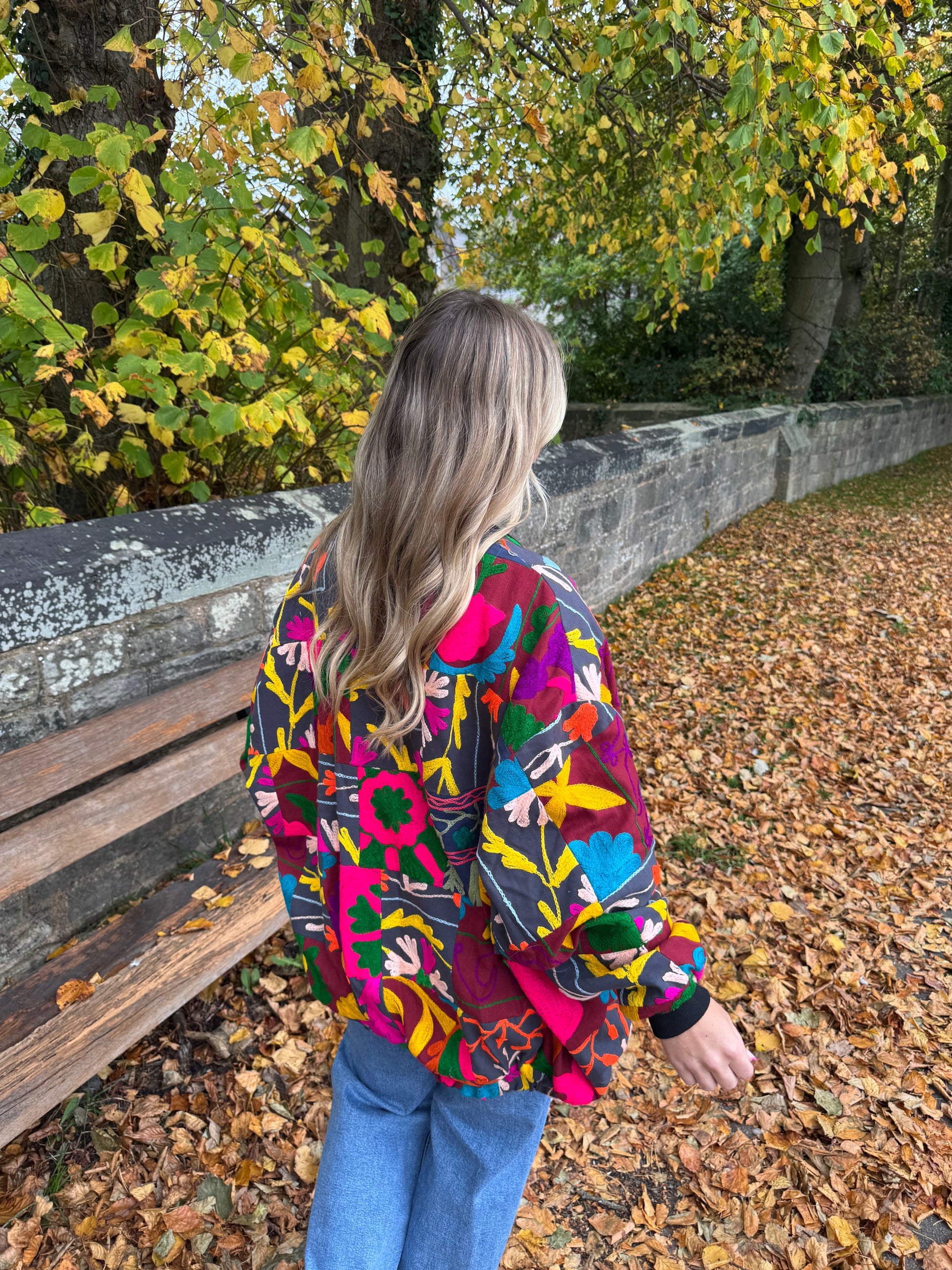 Crafted from exquisite vintage sari fabrics, this bomber jacket is a one-of-a-kind piece that carries the charm and character of its origins. The delicate nature of the material reflects its authenticity, meaning it may show subtle signs of its past life, adding to its unique story. Please handle with care, especially when wearing accessories that might catch or snag the fabric. A timeless fusion of heritage and style, this jacket is perfect for those who appreciate sustainable fashion and artisanal craftsmanship.