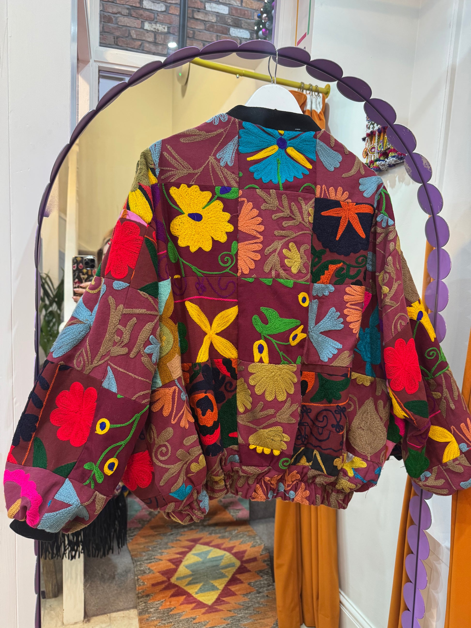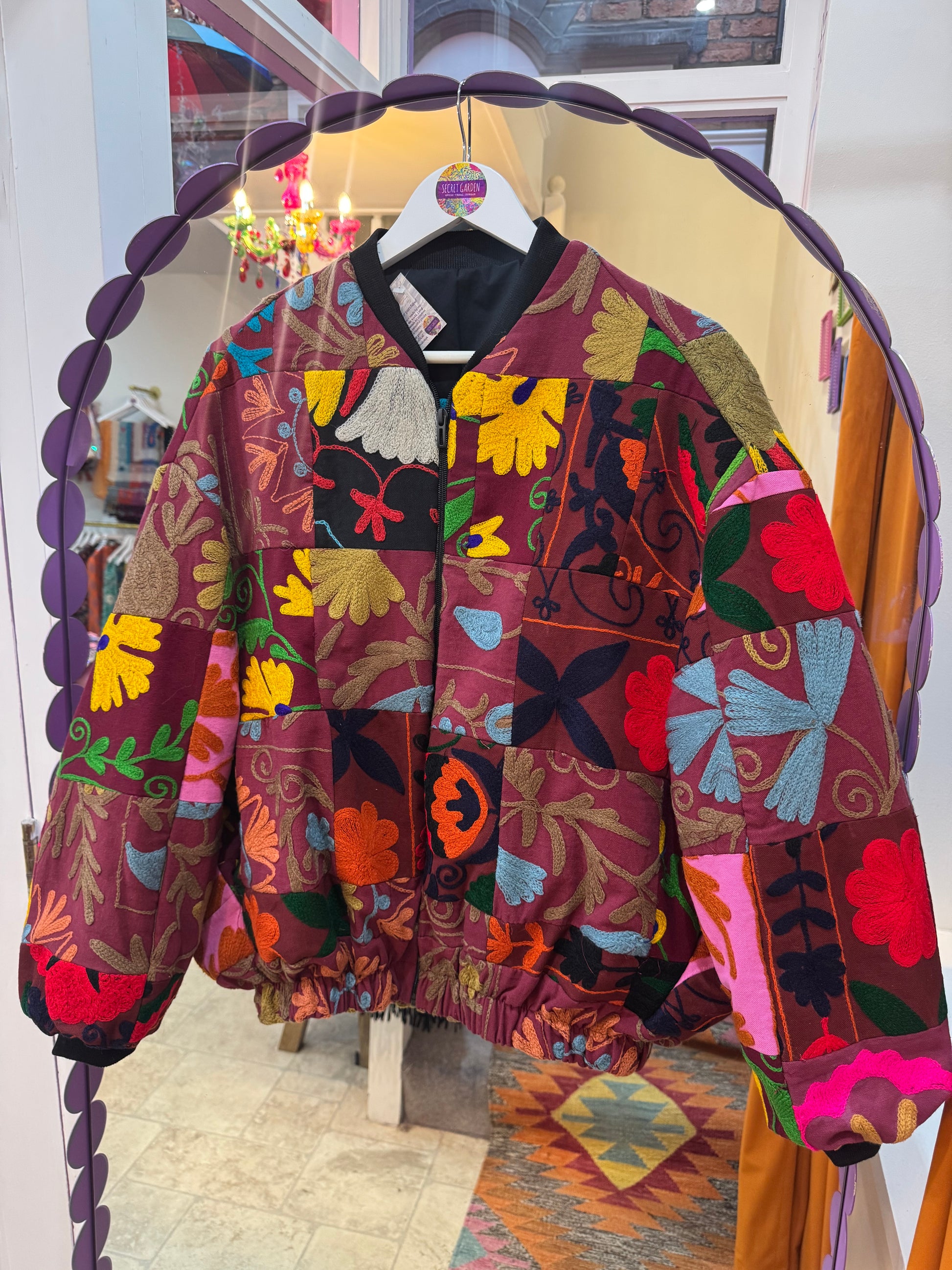 Crafted from exquisite vintage sari fabrics, this bomber jacket is a one-of-a-kind piece that carries the charm and character of its origins. The delicate nature of the material reflects its authenticity, meaning it may show subtle signs of its past life, adding to its unique story. Please handle with care, especially when wearing accessories that might catch or snag the fabric. A timeless fusion of heritage and style, this jacket is perfect for those who appreciate sustainable fashion and artisanal craftsmanship.