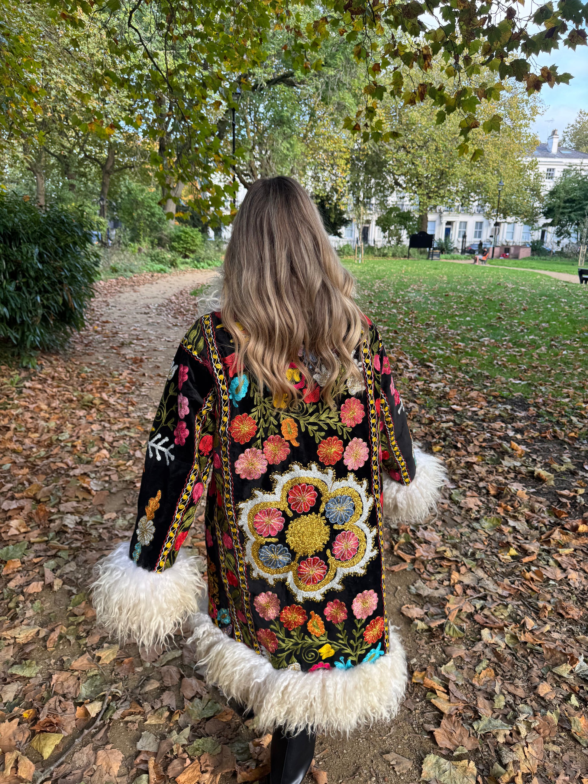 Each piece is crafted from rare vintage Suzani embroidery and upcycled sheepskin—materials that are as unique as they are sustainable. This isn’t just a coat; it’s a timeless piece of wearable art that you’ll treasure in your wardrobe forever. The quality, artistry, and story behind every stitch make it truly worth the investment.