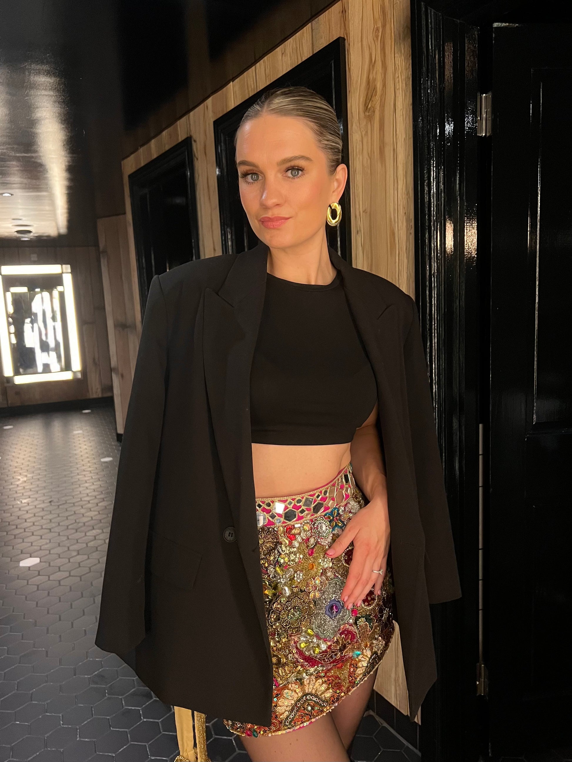 Upcycled skirt using embellished sari wedding fabric. Fitted mini skirt style. Zip & Hook & Eye Closure.