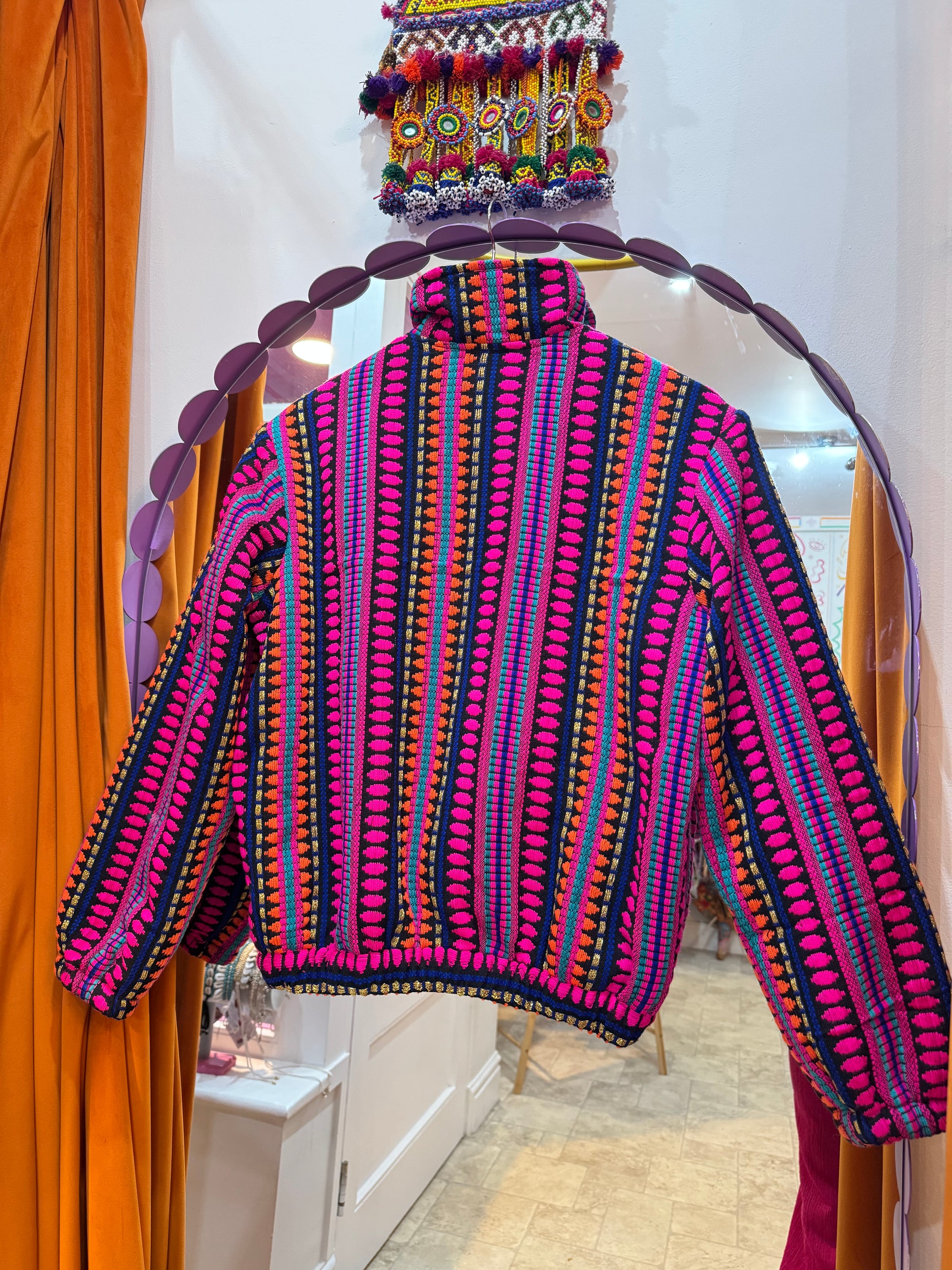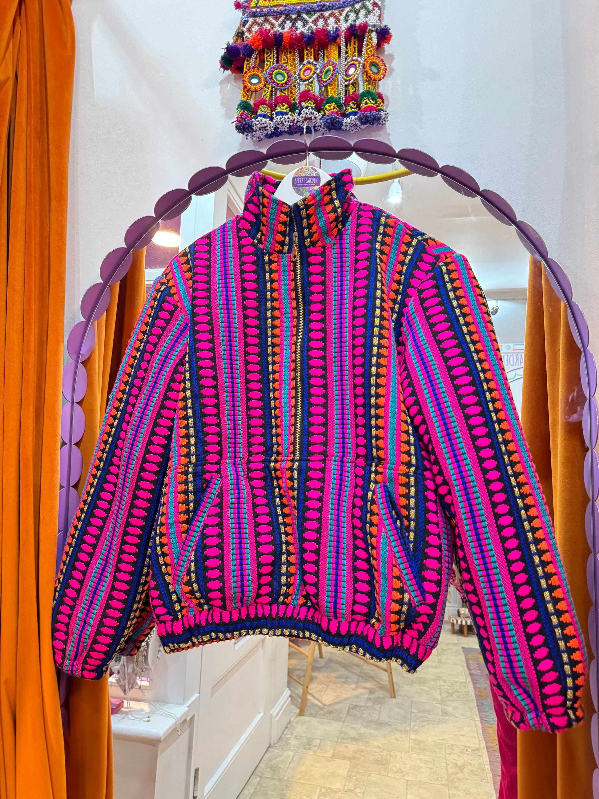 Vintage Hooded Fleece Jacket with 3/4 zip. Zig Zag embroidery used to create a beautiful jacket, perfect to style everyday or snug at festivals! Our jacket has 2 pockets at the front and is fully lined with a soft teddy fleece fabric which will also keep you warm.