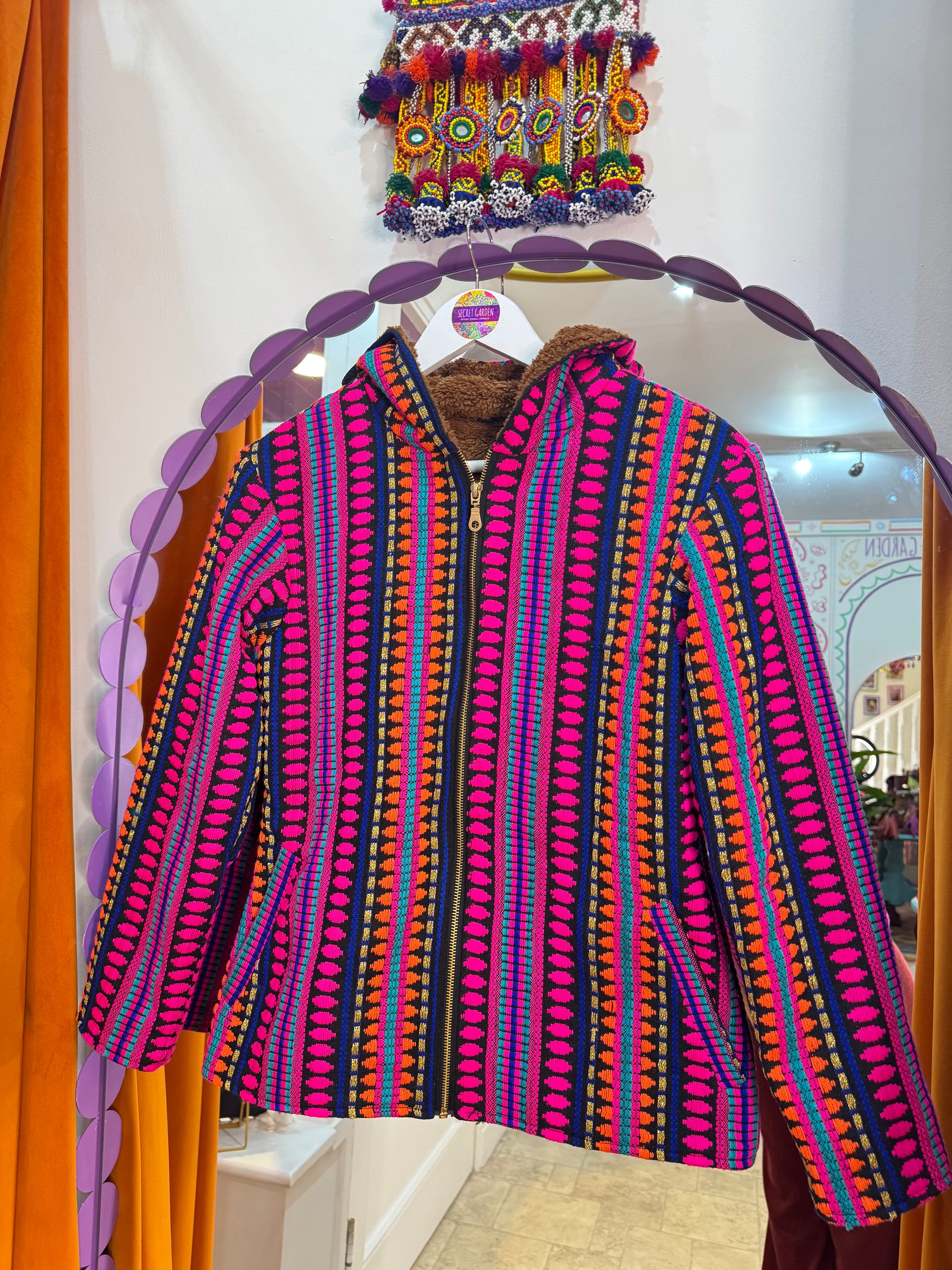 Vintage Hooded Fleece Jacket with zip. Zig Zag embroidery used to create a beautiful jacket, perfect to style everyday or snug at festivals! Our jacket has 2 pockets at the front and is fully lined with a soft fleece fabric which will also keep you warm.